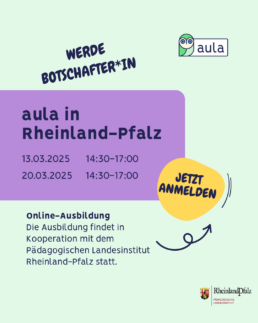 Wie können Schülerinnen und Schüler mehr Mitbestimmung im Schulalltag erleben? Mit aula wird Partizipation nicht nur gefördert, sondern aktiv gelebt! Damit die Umsetzung gelingt, bildet aula in Kooperation mit dem Pädagogischen Landesinstitut Rheinland-Pfalz im Frühjahr 2025 neue Botschafter*innen aus.
