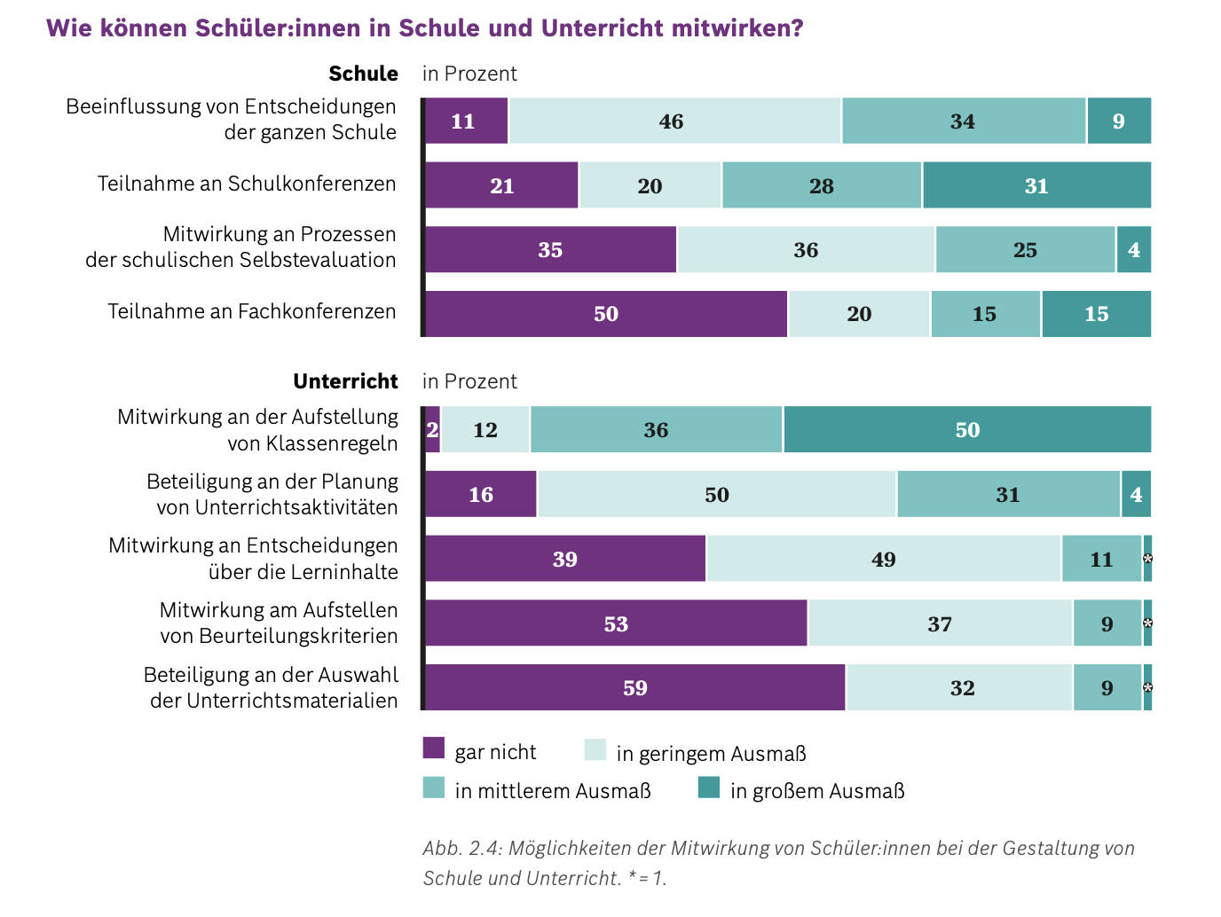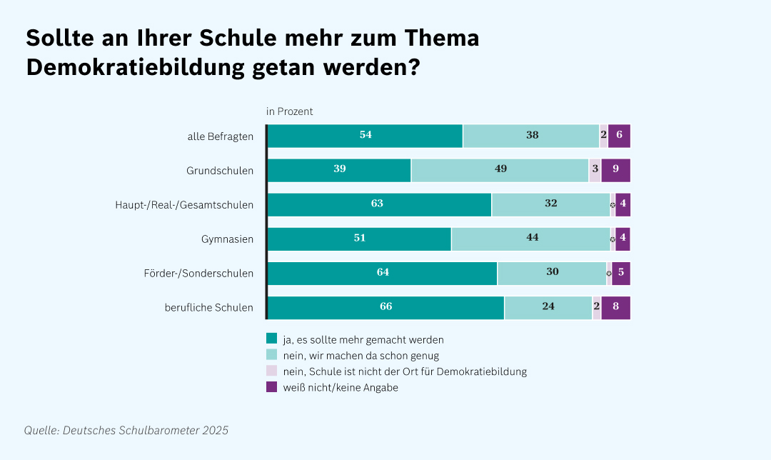 Im internationalen Vergleich liegt Deutschland damit deutlich hinter anderen Ländern. Laut ICCS-Studie berichten 31 % der europäischen Lehrkräfte von mittlerer bis hoher Mitbestimmung durch Schüler*innen – also dreimal so viele wie in Deutschland (Deimel et al., 2024, in: Deutsches Schulbarometer 2025, S.26).